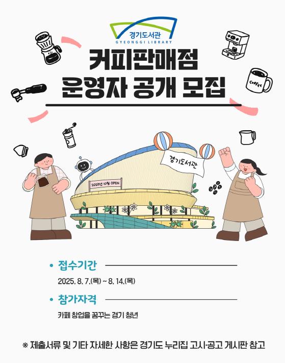한편, 경기도는 경기도서관 지하 1층 편의점 운영 사업자도 8월 6일까지 별도로 모집하고 있다. 관련 내용은 경기도 누리집 고시·공고 게시판에서 확인할 수 있다.