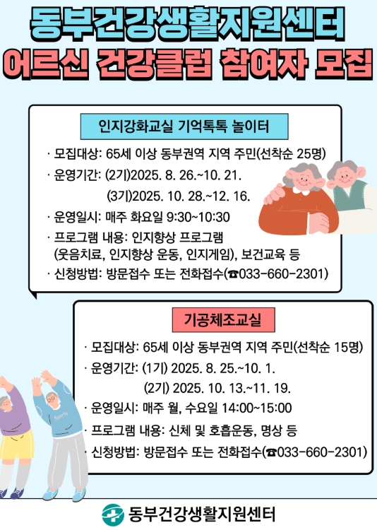 참여대상은 교2동, 포남1·2동, 송정동, 초당동 소재 65세 이상 주민으로, ‘기억톡톡 인지강화교실(2·3기)’는 기수별 25명, ‘기공체조교실(1·2기)’는 기수별 15명을 선착순으로 모집한다.
