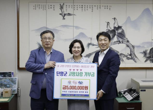 이날 행사에서 부여군시설관리공단 임직원 일동은 고향사랑기부금 500만 원을 단양군에 전달했으며, 이에 대한 화답으로 단양관광공사 임직원도 오는 7월 중 부여군에 기부금을 전달할 예정이다.