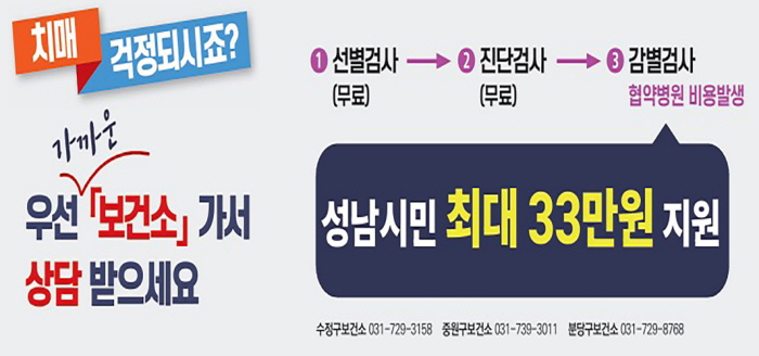 이에 따라 치매 감별검사가 필요한 시민은 최대 33만원의 성남시 지원금을 받게 됐다. 국도비 8~11만원(기준중위소득 120% 이하 국비, 120% 초과 도비 지원)까지 합치면 최대 44만원을 지원받는다.