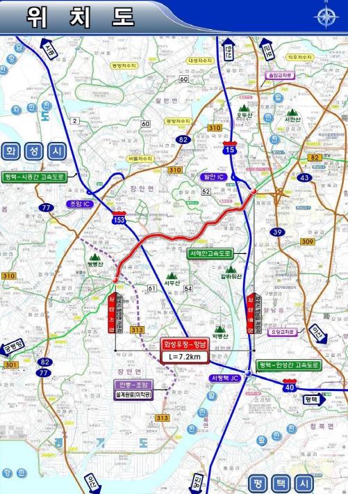 국지도 82호선 우정~향남 도로확장공사는 화성시 장안면 어은리와 향남읍 제암리를 연결하는 총 7.27km 구간 왕복 4차로 확장 공사다. 총사업비는 1,093억원이며 공사기간은 5년(60개월)이다.