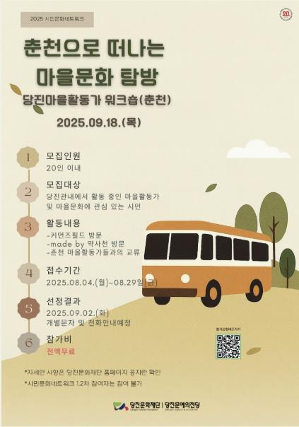 한편, 2025 시민 문화 네트워크의 다양한 분야 참여 확대를 위한 운영 방침에 따라, 기존 충주(1회차) 및 속초(2회차) 워크숍에 참여한 분들은 이번 프로그램 참여가 제한된다. 재단은 이를 통해 더 많은 시민이 네트워크 프로그램에 참여할 수 있도록 기회를 넓히고자 한다고 밝혔다.