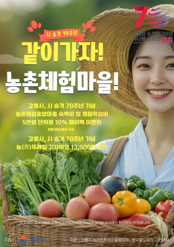 김경태 농정과장은 “이번 할인행사는 강릉시 승격 70주년을 기념하는 동시에, 시민과 관광객 모두가 강릉의 아름다운 농촌에서 즐거운 추억을 만들 수 있는 계기가 될 것”이라며, “강릉의 농촌 관광이 보다 실속있고 접근성 높은 형태로 발전할 수 있도록 지속적인 정책을 이어가겠다.”고 밝혔다.