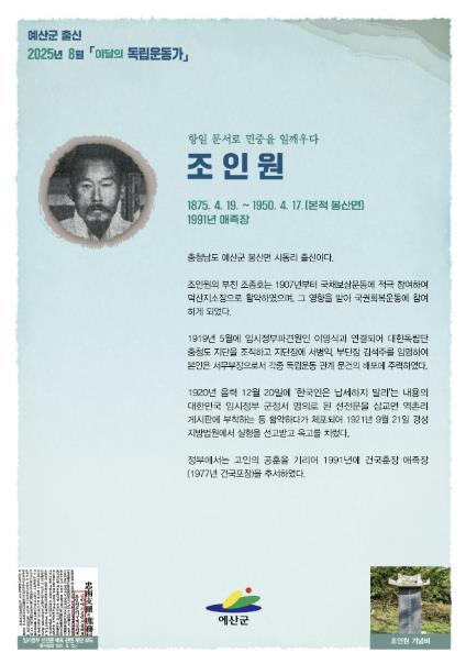 ‘이달의 독립운동가 선정’은 군 자체 사업으로 국가보훈부가 선정한 한국의 독립운동가 중 예산 출신 독립운동가를 매월 선정해 포스터를 제작하고 관내 초중고등학교와 보훈회관, 공공기관, 금융기관, 군청 누리집 등에 게시하는 사업이며, 현재까지 국가보훈부에 등록된 예산 출신 독립유공자는 총 107명이다.
