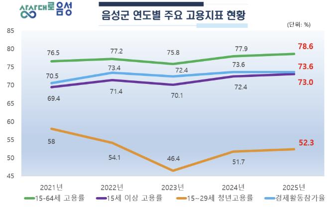 지난해 하반기 대비 취업자 수는 6만8400명에서 1800명이 증가한 7만200명을 기록했고, 실업자 수는 600명이 감소한 500명으로 나타났다. 또 상용근로자 수는 5만7600명 대비 1600명이 증가한 5만9200명으로 음성군의 일자리 질 지표도 우수한 것으로 파악됐다.