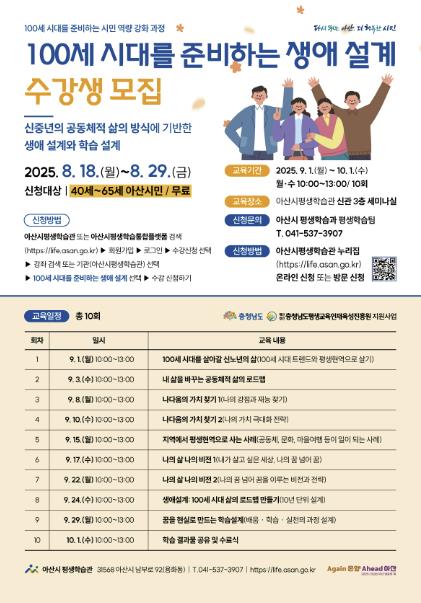 신청대상은 40세~65세 아산 시민이며, 8월 18일부터 8월 29일까지 선착순으로 모집한다. 신청은 아산시평생학습관 누리집을 통해 가능하다.