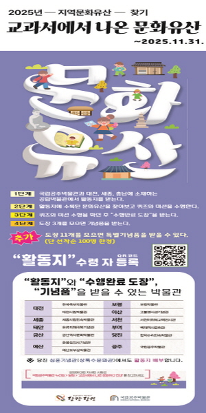 국립공주박물관 및 충남-대전-세종지역 공립박물관과 협력해 지난 4월부터 진행한‘2025년 지역문화유산 찾기 교과서에서 나온 문화유산 사업’은 심훈기념관, 기지시줄다리기박물관, 합덕수리민속박물관에서 11월 30일까지 진행된다.