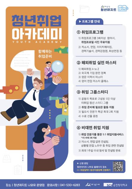 모집 대상은 아산시에 거주하는 만 18세~39세 청년으로, 관내 기업에 재직 중인 청년과 대학생도 신청할 수 있다. 주요 프로그램은 ▲취업 프로그램 ▲해외취업 실전마스터 ▲취업 그룹스터디 ▲비대면 취업 컨설팅 등이다.