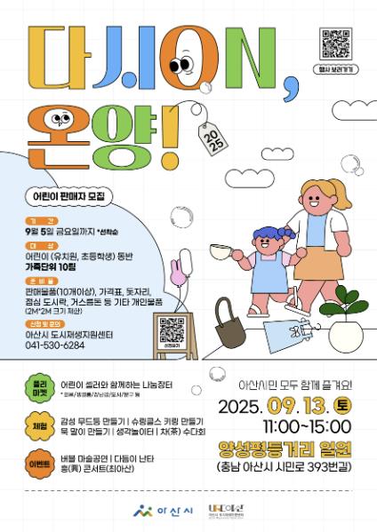 아산시 도시재생지원센터가 주최하는 이번 행사는 원도심 활력 회복과 주민 참여 확대를 위해 마련됐으며, 남녀노소 누구나 즐길 수 있는 벼룩시장(플리마켓), 체험 프로그램, 공연 등이 진행된다.
