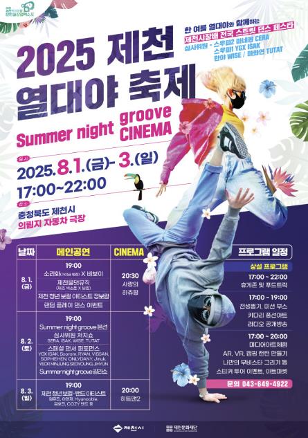 한편 ‘제천 열대야 축제’는 제천문화재단이 올해 처음 선보이는 여름 문화 예술 축제로,‘열대야’라는 계절적 키워드를 도시문화와 접목해 제천을 ‘젊음의 도시, 댄스의 도시, 영화의 도시’로 표현해 한여름 밤을 시원하게 물들일 제천만의 새로운 축제이다.