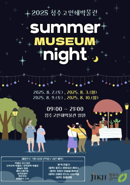 청주고인쇄박물관 관계자는 “박물관으로 밤 나들이 오셔서 야간 관람과 다양한 프로그램 체험으로 즐겁고 행복한 여름밤을 보내시길 바란다”며 “박물관이 방문객 누구나 편하게 누릴 수 있는 문화휴식 공간이 되도록 노력하겠다”고 밝혔다.