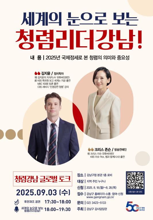 이번 행사에는 정치학자인 김지윤 박사와 방송인 크리스 존슨이 출연해 세계적 시각에서 청렴을 풀어낼 예정이다. 김 박사는 국제 이슈를 쉽게 풀어내는 유튜브 채널 '지식 플레이'(구독자 128만)를 운영하고 있으며, 크리스 존슨은 방송 프로그램 '이슈Pick, 쌤과 함께' 등을 통해 공적 담론에 활발히 참여해온 인물이다. 이들은 ▲세계 청렴 흐름과 시민의 역할, ▲국제 정세 속 청렴의 의의, ▲국제적 시선에서 본 청렴 강남 등을 주제로 글로벌 시각에서 청렴을 풀어낼 예정이다.