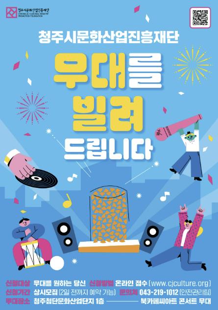 청주시문화산업진흥재단이 지난해에 이어 올해도, 공간 무상 대여 사업 ‘무대를 빌려드립니다!’를 추진한다고 밝혔다.