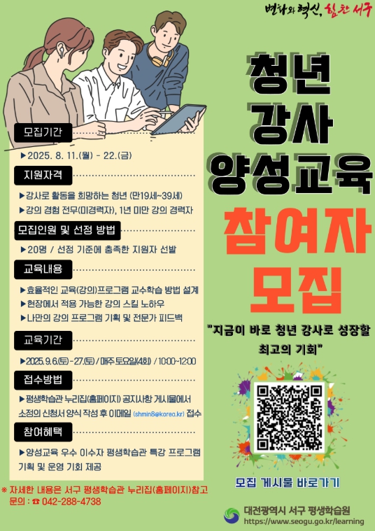 서철모 구청장은 “청년들이 전문 강사로 성장할 수 있도록 체계적인 교육 기반을 마련하고, 나아가 지역사회에도 공헌할 수 있도록 적극 지원하겠다”고 말했다.