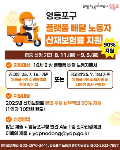 이번 지원은 영등포구에 거주하거나 영등포구 내 사업장에서 근무하는 만 18세 이상의 플랫폼 배달노동자를 대상으로 하며, 2025년 1월 이후 본인이 납부한 산재보험료 자기부담분에 대해 신청할 수 있다.