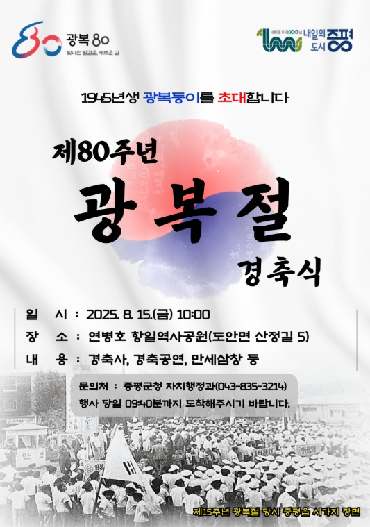군 관계자는 “이번 경축식은 광복 80주년을 맞아 광복의 역사적 의미를 되새기고 모두가 하나되는 화합의 장이 될 수 있도록 준비했다”며 “특히 광복둥이 어르신들이 함께하는 이번 경축식이 군민 모두가 하나 되는 화합의 장이 되길 바란다”고 말했다.