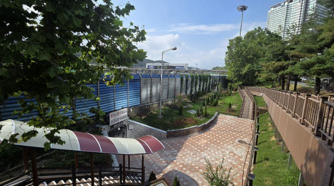 이중 지붕 달린 나무 계단과 태양광 조명시설은 인근 두산에너빌리티와 HD한국조선해양이 각각 5000만원씩 기부한 기금(1억원)으로 설치했다. 해당 시설은 성남시에 기부채납 예정이다.