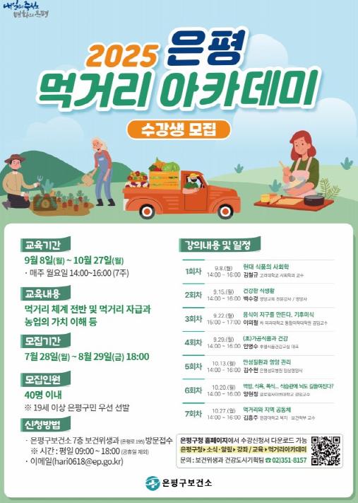 은평구 보건소 관계자는 “구민 스스로가 건강한 몸을 위한 먹거리 실천 계획을 수립할 수 있도록 이번 아카데미가 마련됐다”며 “지속가능한 먹거리 문화 조성을 위해 구민들의 많은 참여 바란다”고 말했다.