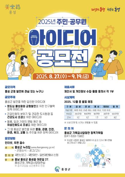 공모의 소주제로는 ▲원도심 활성화와 균형발전을 위한 인구활력 정책 아이디어 ▲건강 친화적 분위기 및 건강한 도시환경 등 건강도시 조성을 위한 아이디어 ▲돌봄, 일과 가정의 양립 여건 조성 여성친화도시 조성을 위한 아이디어 그 밖에 홍성군 발전을 위한 문화, 관광, 안전, 환경, 복지, 교통 등 주민을 위한 정책 아이디어도 자유롭게 응모 가능하다.