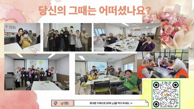 ‘마음을 전하는 QR엽서’는 치매 어르신이 직접 색칠하고 꾸민 엽서에 QR코드를 삽입하여 어르신이 미술치료, 인지활동프로그램 등 다양한 활동에 참여하는 모습과 작품 등을 영상과 사진으로 담아 가족들에게 전송하는 사업이다. 엽서를 받은 가족들은 QR코드를 통해 스마트폰으로 참여모습을 바로 확인할 수 있어 멀리 떨어져 있거나 어르신의 상태를 자주 확인하기 어려운 가족에게 큰 위로가 되고 있다.