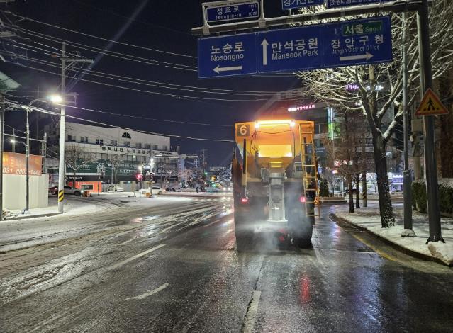 수원시는 오후 4시부터 9시까지 관내 모든 구간에 제설제 538t을 살포했고, 제설 장비 106대, 제설 인력 224명을 동원해 제설 작업을 하고 있다. 민원 발생 지역, 이면도로 제설 작업도 지속해서 하고 있다.