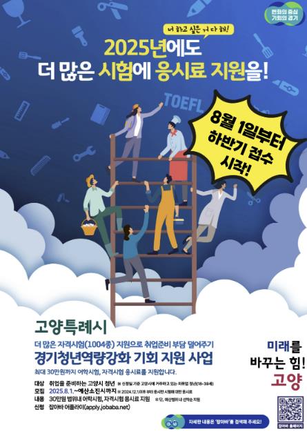 이동환 고양시장은 “이번 지원이 취업 준비에 비용 부담을 느끼는 청년들의 취업 역량을 강화하는 계기가 되길 바란다”며 "앞으로도 청년들의 든든한 버팀목이 될 수 있도록 지속적으로 힘을 보태겠다”고 말했다.