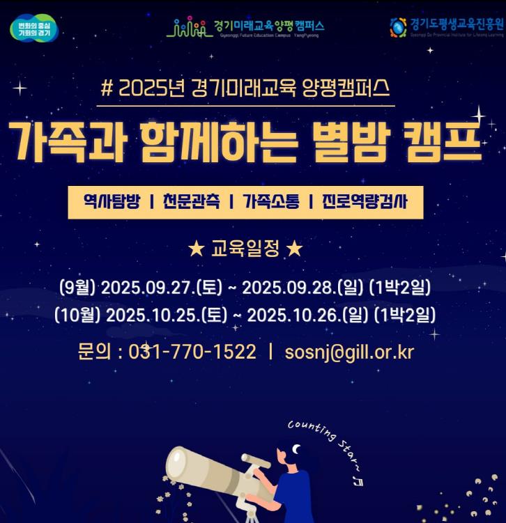 경기미래교육 양평캠퍼스를 거점으로 여주시 세종대왕릉, 양평군 중미산천문대 등 역사와 자연이 어우러진 현장에서 다양한 체험 활동을 진행한다. 첫날에는 세종대왕릉 탐방 프로그램을 운영해 문화관광해설사의 설명과 함께 가족 단위로 조선의 역사와 문화유산을 배우는 시간을 갖는다. 이어지는 야간 프로그램에서는 중미산천문대에서 천문 강의와 별자리 관측 체험을 진행한다. 실제 밤하늘의 별자리와 행성을 관측하며 과학적 호기심과 감성을 자극하는 특별한 경험을 하게 된다.