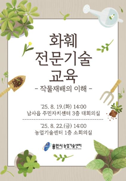 교육은 ▲8월 19일 남사읍 주민자치센터 3층 대회의실 ▲8월 22일 원삼면 농업기술센터 1층 소회의실에서 진행되며, 동일한 강의 내용과 강사진으로 2회 운영된다.