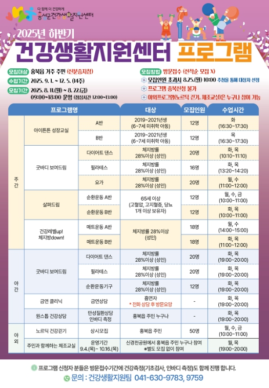 특히 체지방률 28% 이상이거나 고혈압·고지혈증·당뇨 중 1개 이상을 가진 지역 주민의 건강 증진을 위해 ▲아이튼튼 성장교실(놀이형 신체활동) ▲굿바디 보여드림(순환운동, 댄스다이어트, 필라테스, 요가) ▲살펴드림(순환운동) 등 총 13개 반을 주간·야간·야외로 운영한다.