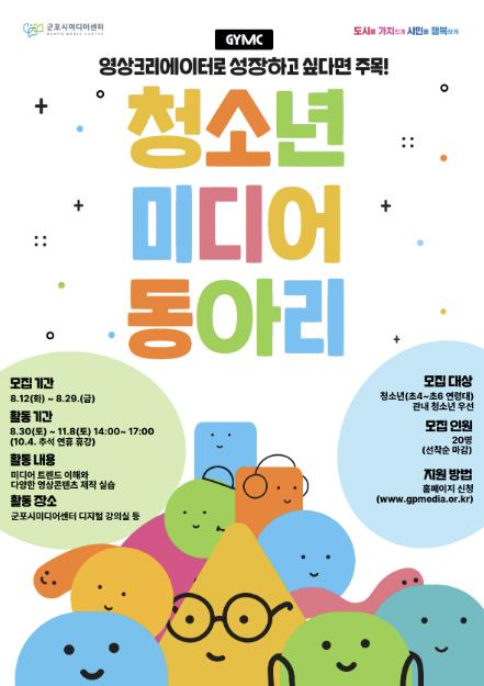 모집인원은 총 20명이며, 모집 기간은 8월 12일~8월 29일이고, 활동은8월 30일부터 매주 토요일 군포시미디어센터에서 진행될 예정이다.