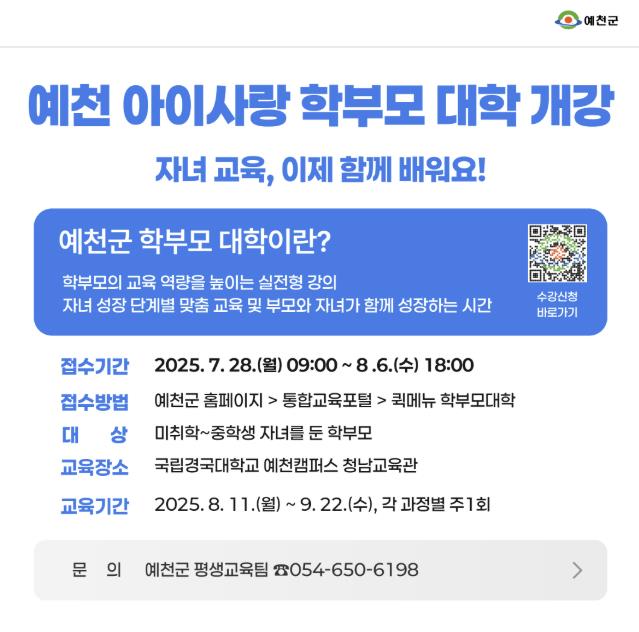 이번 학부모대학은 8월 11일부터 국립경국대학교 예천캠퍼스 청남교육관에서 진행되며, 예천군에 거주하는 미취학 자녀부터 중학생 자녀를 둔 학부모를 대상으로 맞춤형 교육과정을 제공한다.