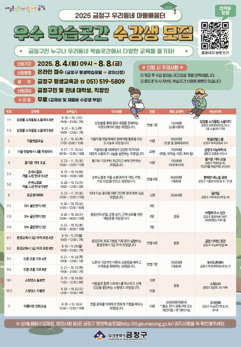 하반기에는 11개소의 우수 학습곳간에서 총 18개의 프로그램을 8월부터 운영하며 수강생은 8월 4일부터 8월 8일까지 금정구 평생학습포털을 통해 온라인으로 모집한다.