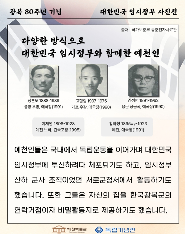 이처럼 예천 출신 독립유공자들의 항일투쟁은 무장투쟁, 자금 지원, 비밀연락 활동 등 다방면에서 이뤄졌으며, 이는 임시정부의 존립과 독립운동의 지속에 중요한 토대가 됐다.