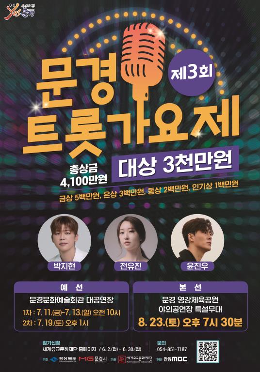 신현국 문경시장은 “문경트롯가요제가 해를 거듭할수록 전국적인 관심과 참여를 이끌어내며 문경의 대표 문화 브랜드로 자리매김하고 있다.”라며, “올해도 참가자와 관객 모두가 즐길 수 있는 행사를 통해 문경의 매력을 널리 알리겠다.”고 말했다.
