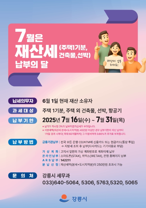박일규 세무과장은 “지역 경기 침체로 인한 경제적 어려움과 바쁜 일상으로 시민들이 납부 기한을 놓쳐 3%의 납부지연가산세 등 불이익을 받을 수 있으니 다양한 납부 방법을 활용하여 납부 기한인 오는 7월 31일까지 재산세를 꼭 납부해 주실 것을 당부드린다.”고 말했다.