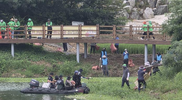 복구에 힘을 모은 참여자들은 무더운 날씨에도 부유 쓰레기 수거에 구슬땀을 흘렸다.