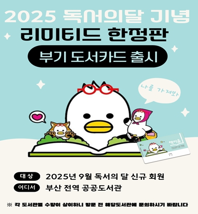이번 행사는 부산 시민의 도서관 이용 활성화와 독서문화 진흥을 목적으로 마련됐으며, 도서관 신규회원 가입 시 ‘부기’ 캐릭터가 디자인된 도서 카드를 제공해 더욱 친근하고 즐거운 독서 경험을 지원한다.