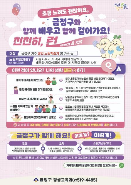 이에 금정구는 지난해 9월 느린학습자 평생교육 지원 조례를 마련했으며, 이를 근거로 성인 느린학습자를 위한 체계적인 평생교육 지원 체계를 구축하고 나섰다.