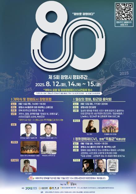 14일에는 일직동 아이벡스 스튜디오에서 평화주간 개막식과 함께 ‘평화도시 광명포럼’이 열린다. 이재정 전 통일부장관이 ‘분단의 역사, 평화의 미래’를, 박태균 서울대 교수 ‘광복 80주년을 통해 보는 미래 100년의 평화와 통일’을 주제로 강연을 펼쳐 평화에 대한 깊이 있는 통찰을 나눈다.
