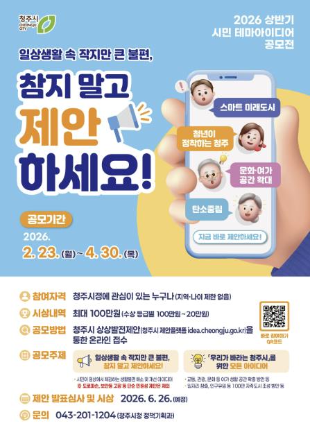 공모 주제는 ‘일상생활 속 작지만 큰 불편, 참지 말고 제안하세요!’다. 교통·안전·환경·행정서비스 등 생활과 밀접한 분야는 물론 청주시에 바라는 창의적이고 미래지향적인 제안까지 폭넓게 접수한다.