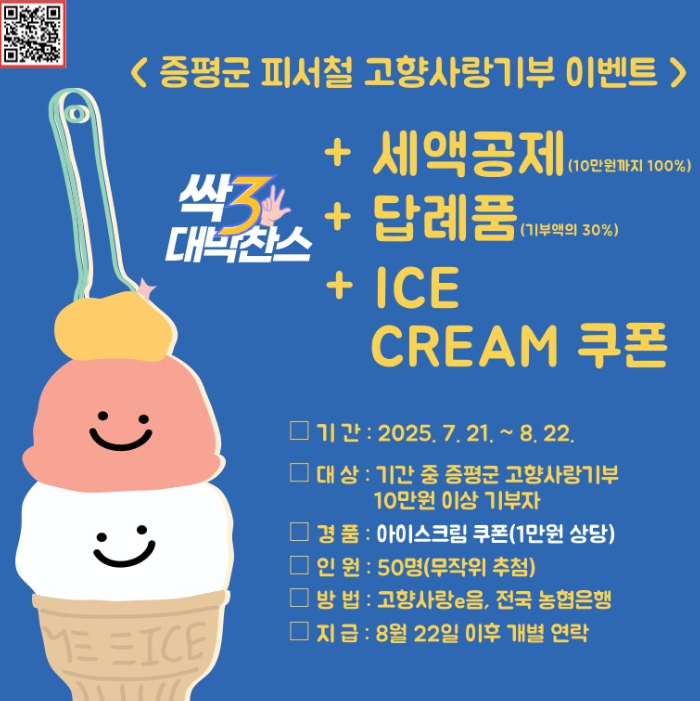 이번 이벤트는 군에 10만 원 이상 기부한 참여자 중 50명을 추첨해 아이스크림 쿠폰(1만원 상당)을 제공하는 행사다.
