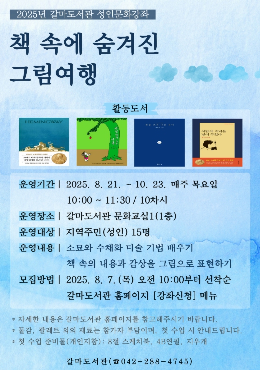 강좌는 지역 주민 누구나 신청이 가능하며, 이달 7일 오전 10시부터 갈마도서관 홈페이지 내 강좌 신청 메뉴를 통해 선착순 15명을 모집한다.