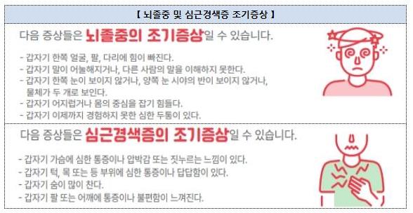 아울러, 뇌졸중과 심근경색증은 환자가 증상을 정확히 인지하고 표현할수록 골든타임 내 신속히 치료받는 것이 수월한 만큼, 환자의 생존율 제고 및 좋은 예후를 위해 질환의 조기 증상을 사전에 인지하는 것이 중요하다.