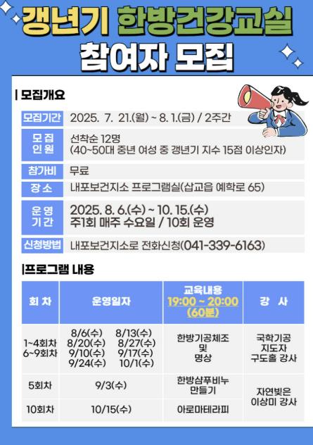 모집 대상은 내포지역에 거주하는 40~50대 중년 여성 가운데 갱년기 지수(쿠퍼만 검사)가 15점 이상인 주민이며, 프로그램은 전액 무료로 운영된다.