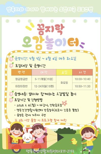 센터는 전문 강사를 초빙해 영유아·아동 프로그램인 ‘꼼지락 오감놀이터’와 ‘쑥쑥·튼튼 체조교실’을 오는 9월부터 11월까지 주 1회 총 8회로 맹동건강생활지원센터에서 진행한다.