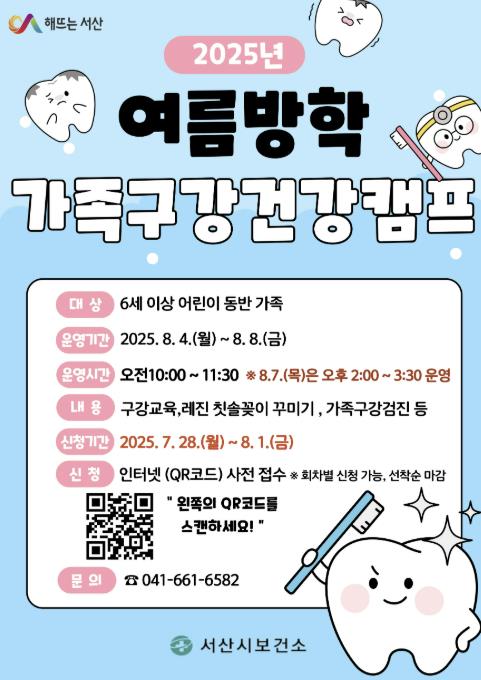 김용란 서산시보건소장은 “이번 캠프가 가족이 함께 참여해 어린이의 올바른 구강관리 습관 형성을 돕는 데 의미가 있다”라며 “앞으로도 전 세대가 함께 실천할 수 있는 구강보건 프로그램을 통해 시민 구강건강 증진에 힘쓰겠다”라고 말했다.