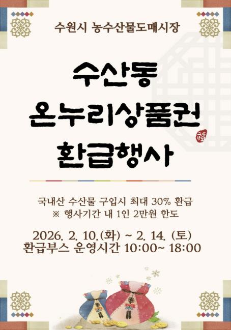수원시 관계자는 “국내 수산물 소비 활성화, 체감 물가 안정화를 위해 온누리상품권 환급행사를 연다”며 “많은 분이 수원시농수산물도매시장을 찾아주시길 바란다”고 말했다.