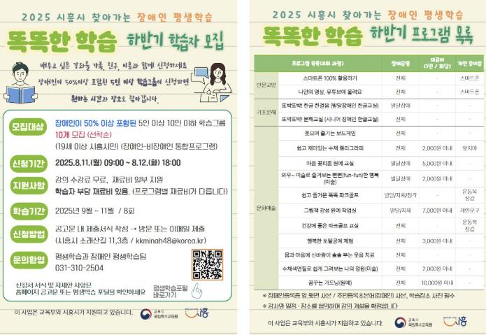 시는 지난 2월 ‘장애인 평생학습도시’로 선정된 이후 장애인의 사회 참여 확대를 위해 진로ㆍ직업탐색 평생학습 영역별 프로그램 등 다양한 분야의 프로그램을 운영하고 있다. ‘똑똑한 학습’ 역시 그 일환으로, 상반기에는 총 6개 프로그램이 운영됐으며, 하반기에는 10개 프로그램으로 확대된다.