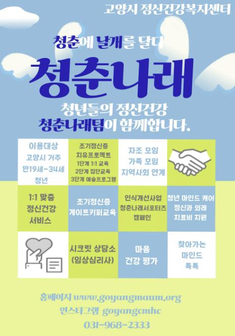 고양시 거주 19~34세 청년들을 대상으로 운영하는 ‘청춘나래’ 정신건강 지원사업은 유관 기관과 협력해 우울, 불안, 스트레스 등 정서적 어려움에 대응할 수 있도록 상담과 개별 및 집단 프로그램을 진행한다.