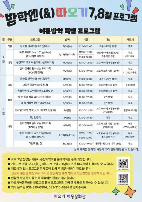 세부 프로그램으로는 ▲동화를 연주해 볼까(아동/7,8월) ▲하프투게더(가족/7,8월) ▲공정무역 푸드 아틀리에(아동/7,8월) ▲심리검사로 알아보는 우리가족(가족/7,8월) ▲내 마음에 색을 입히자(성인/8월) ▲내 몸 사용법(성인/8월) ▲디지털드로잉 명화 굿즈(가족/8월) ▲1인 인형극(가족/8월) ▲그림책 몸, 짓(가족/8월) 등으로 구성돼 있으며, 각 분야 전문 강사진이 프로그램을 진행한다.